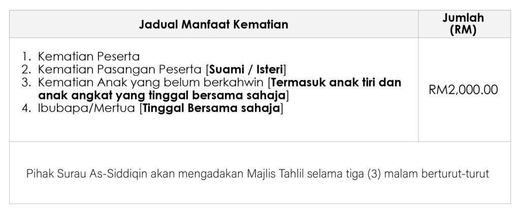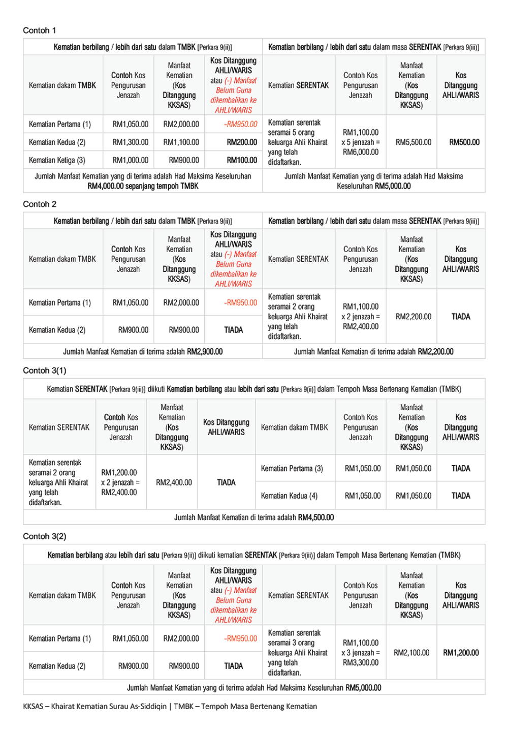 (iv). Kematian berbilang atau lebih dari satu dalam masa SERENTAK – Akan menerima Manfaat Kos Pengurusan Jenazah bagi setiap jenazah dengan had maksima keseluruhan RM5,000.00 dan Manafaat Belum Guna jika keseluruhan kos pengurusan jenazah kurang dari RM2,000.00.