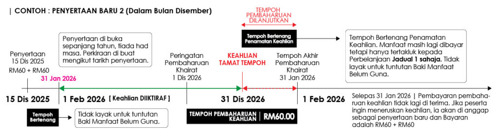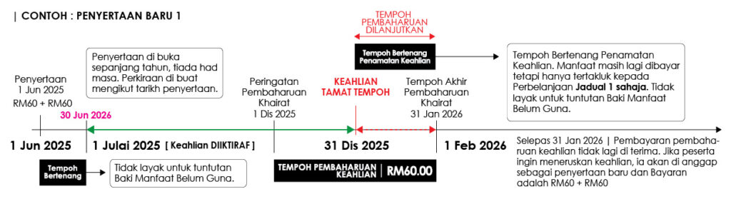 Peserta baru/tambahan hanya diiktiraf menjadi Ahli Khairat bermula selepas tempoh bertenang. Tarikh tamat keahlian adalah ditetapkan pada 31 Disember setiap tahun.